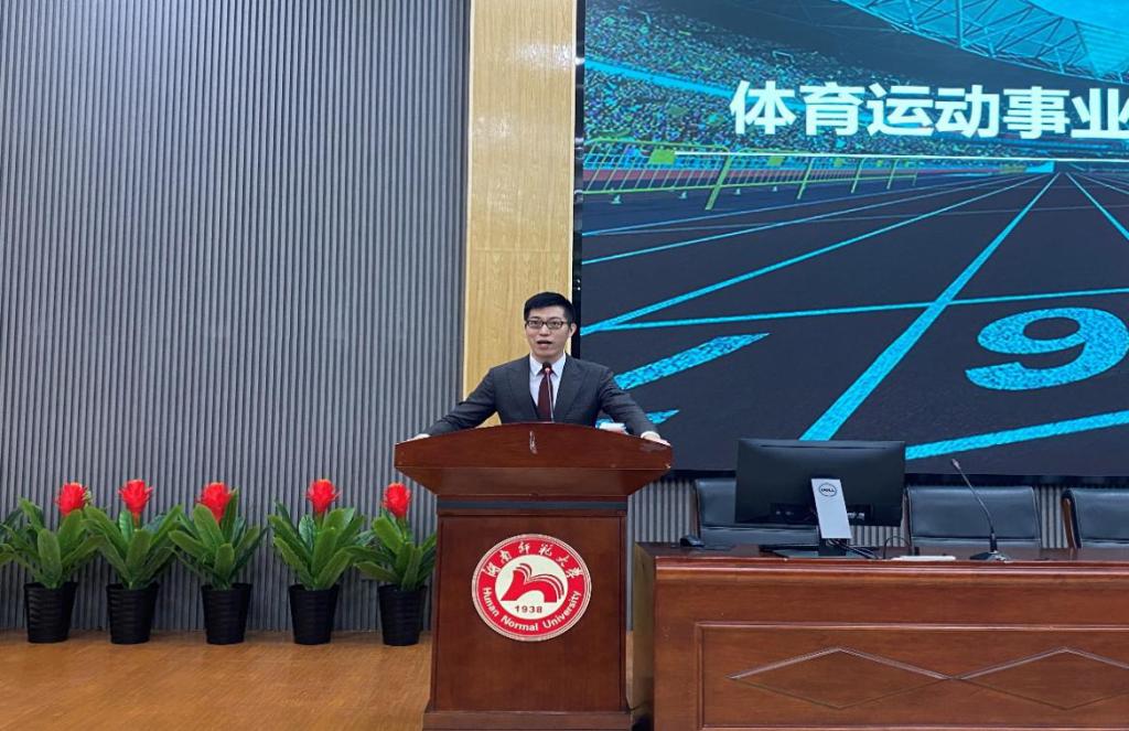 王锐就“体育运动事业发展及就业前景浅析”向同学们进行讲解。他讲到,体育发展真正突破点在蔡元培提出的“三育并重”的体育思想,体育占比在2008年国务院对体育实施的相关政策当中实现快速提升。