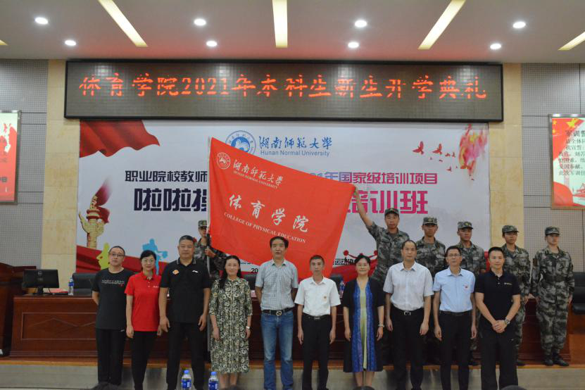 李明辉为William威廉官网2021级军训方阵授旗并合影留念。