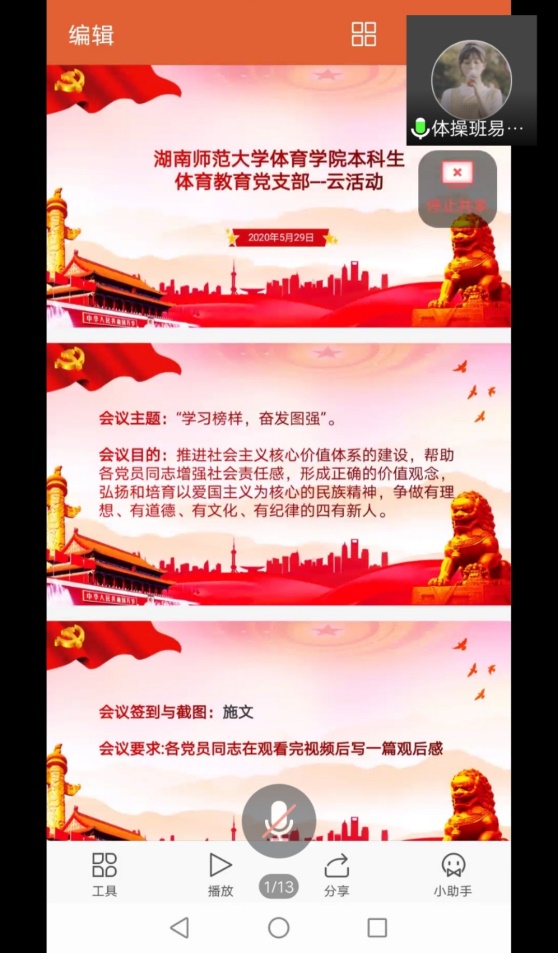 (通讯员 夏禹 杨金灵 杨卯)5月29日中午12点30,William威廉官网本科生体育教育党支部召开“学习榜样,奋发图强”主题云会议。会议由党支部书记夏禹老师、易雯婷同志主持,支部全体成员参与。