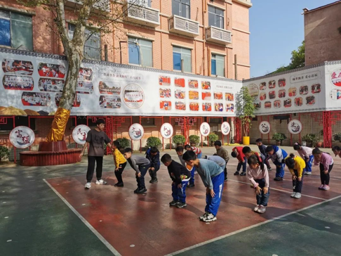 首先,由老师带学生绕场地慢跑两圈,然后在志愿者的带领下进行热身,激发学生的身体机能,预防受伤。在志愿者的耐心指导下,学生们学着做规范的武术礼仪动作。在老师不断的教导与学生们的反复练习后,学生们也都掌握了武术礼仪的基本动作。