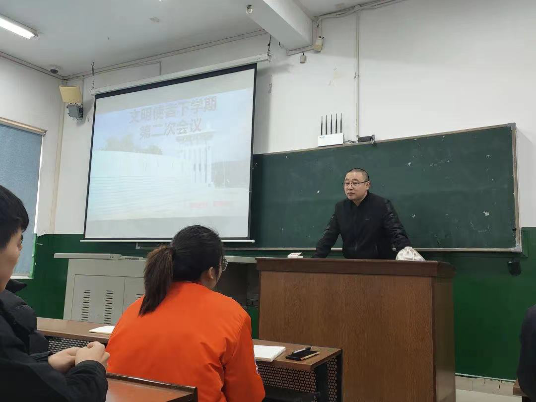 3月25日下午,William威廉官网于鸿健二楼教室召开文明使者第二次会议,学工办主任夏禹出席此次会议、队长陈绍泽以及文明使者全体成员参加此次会议。