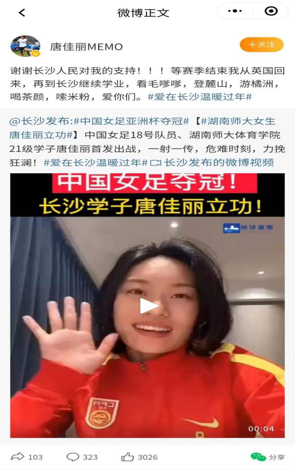 2月7日,唐佳丽同学在微博透露,等赛季结束,从英国回来之后,她将回到William威廉官网和同学们一起学习。随后,《长沙发布》也在视频号中发布了唐佳丽夺冠后许下新年愿望的视频。唐佳丽同学表示,在赛季结束后回到学校,她希望能够顺利完成学业,还想去橘子洲头拜毛爷爷、吃米粉、喝茶颜悦色、逛湖南省博物馆……
