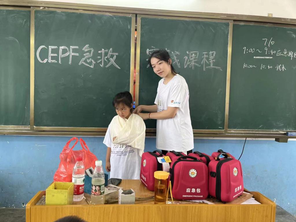 消防避险课程主要培养学员的耐力、反应力,在教会同学识别消防标识、器材并引导学生了解它们的使用方法外,通过消防知识与体适能训练相结合,提升青少年儿童面对突发的消防事故时的应对能力,在提升青少年儿童身体素质的同时,降低社会突发消防事故伤亡率。医疗急救避险课程倡导“人人会急救”的思想,在此次暑期社会实践活动中,团队成员带领实践地学校同学了解三角巾在包扎时的适用情况,能够掌握头部包扎、风帽式包扎、悬臂包扎、胸背包扎等包扎方法。通过对于青少年相关急救知识的培训与教学,达到青少年在紧急情况发生时能够第一时间进行反映,并做出处理,以减少二次损伤。在防溺水避险课程中组织同学们进行防溺水情景模拟,通过体适能训练提高儿童的身体素质,并且掌握基本溺水自救方法,以及心肺复苏等急救方法。在应激反应避险课程中,领梦者实践团践行快乐体育的教学理念,通过设置“男生女生向前冲”冲关挑战的形式,主要培养学员敏捷性、反应力和自我保护能力,提高辨别和应对危险的能力,增强安全防范意识。