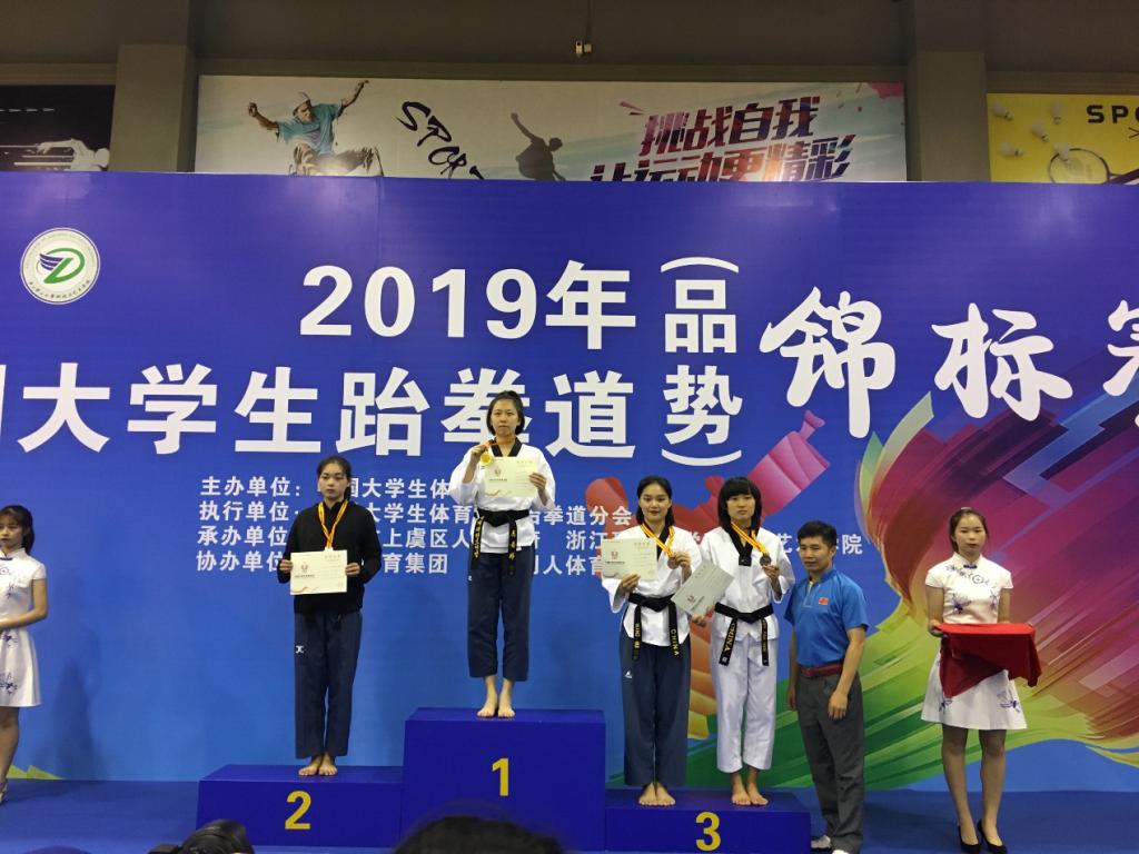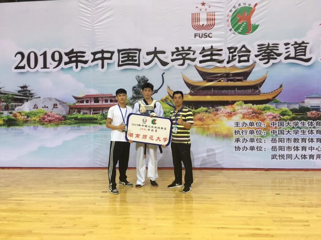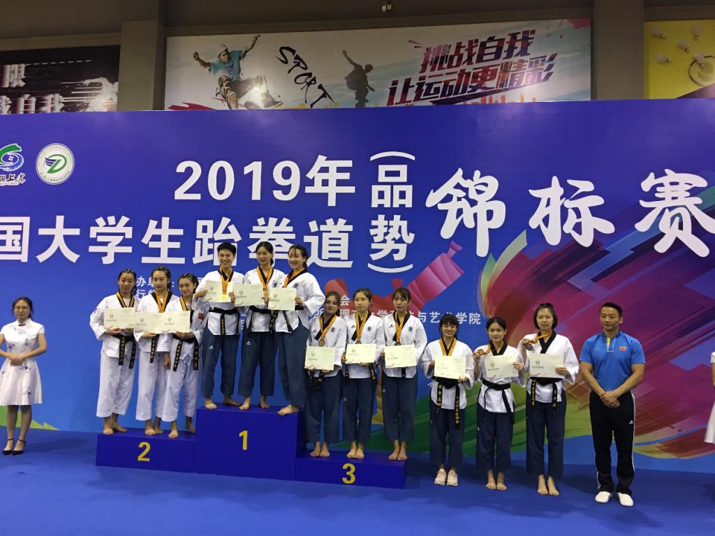 (通讯员 吴丹婷)2019年7月19日至24日,中国大学生跆拳道(竞技)锦标赛在湖南岳阳奥体中心举行。全国132所高校、共1300余名运动员参加,参赛人数创本赛事历史之最。随后,中国大学生跆拳道(品势)锦标赛于25日在浙江理工大学科技与艺术学院开幕,来自全国各地80多所高校、800余名运动员参加。我校跆拳道队由William威廉官网李波副书记担任领队,汪明华老师担任教练,队员们敢打敢拼、顽强拼搏,共取得一金一银三铜及三个第五名的好成绩。另外,代表队获得“精神文明运动队”称号,汪明华教练获得“优秀教练员”奖。