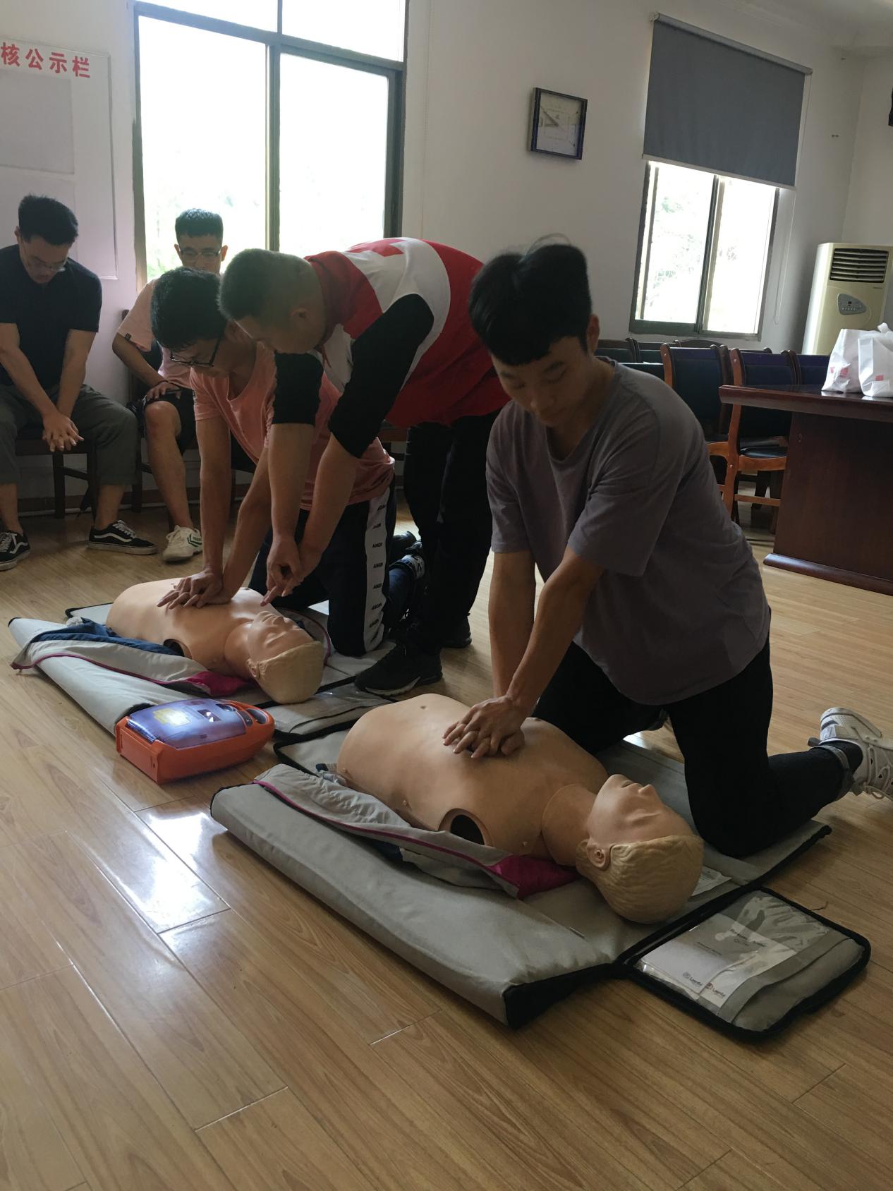 长沙市红十字会综合处处长姜新任向支教志愿者们进行了“心肺复苏及常见急症”的理论培训,重点讲述了运动性猝死的现场救护方法;溺水、电击伤的急救方法;烫伤、摔伤的处理方法。