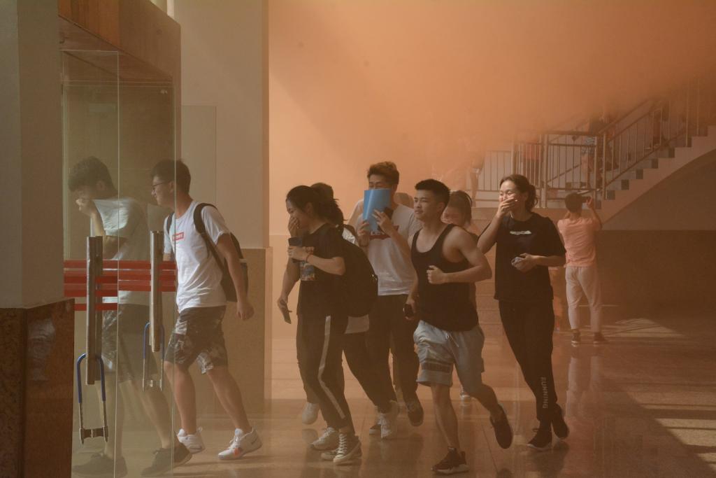 吴德亮首先向大家普及了基本的消防常识,并结合视频实例进行培训。他介绍到,火灾引发大多是因为忽略生活中的小细节导致。火灾发生分为四个阶段:初期阶段、发展阶段、猛烈阶段,结束阶段,灭火的黄金时间就在初期阶段的0—7分钟内。随后,他现场讲解示范如何使用灭火器、防毒面具等器材,并随机邀请同学上台演示。最后,报告厅现场进行实景演练,用一个烟雾弹模拟火灾发生时的情景,引导学生如何撤离火灾现场。