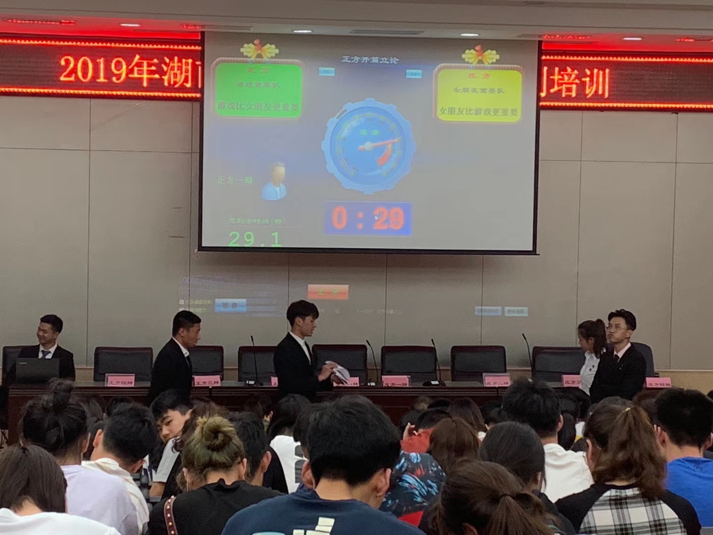 随后,现场进行了一场趣味辩论赛——花辩。四位辩手以幽默的口吻一本正经的辩论女朋友与游戏谁重要,引起一阵阵笑声,可谓是一大亮点!