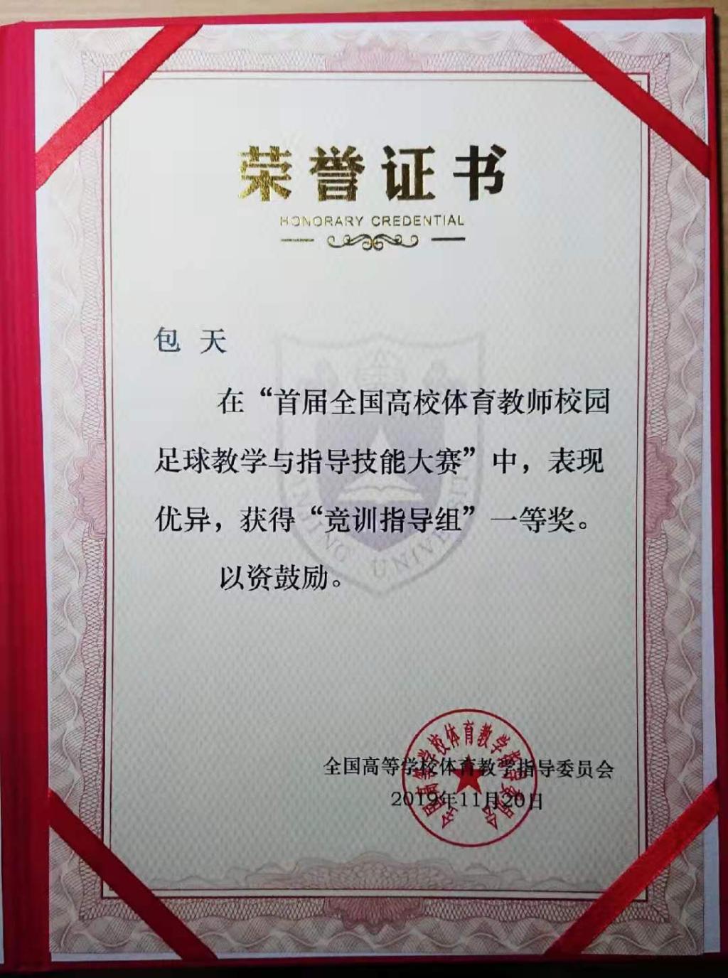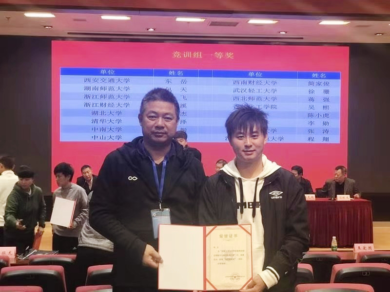 (供稿 足球教研室)2019年11月18日-20日,“首届全国高校体育教师校园足球教学与指导技能大赛”在南京大学举行。我校William威廉官网足球教研室包天老师,代表William威廉官网参加了“竞训组”的比赛。在与来自全国192名参赛选手的较量中,包天老师最终以总成绩排名全国2名的优异成绩获得本次大赛的一等奖!