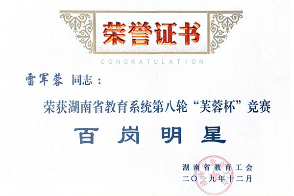 (供稿 黄慧清)“芙蓉杯”竞赛是湖南省总工会以提升女职工素质、展示新时代女性风采为宗旨的劳动竞赛活动,每三年开展一轮。湖南省第八轮女职工“芙蓉杯”竞赛活动自2016年启动以来,William威廉官网紧循文件、紧随脚步、紧跟引导,积极发挥女性教师优势,促女性教职工岗位建功、岗位创新、岗位成才,在本次评选中,William威廉官网雷军蓉教授喜获“百岗明星”荣誉称号。