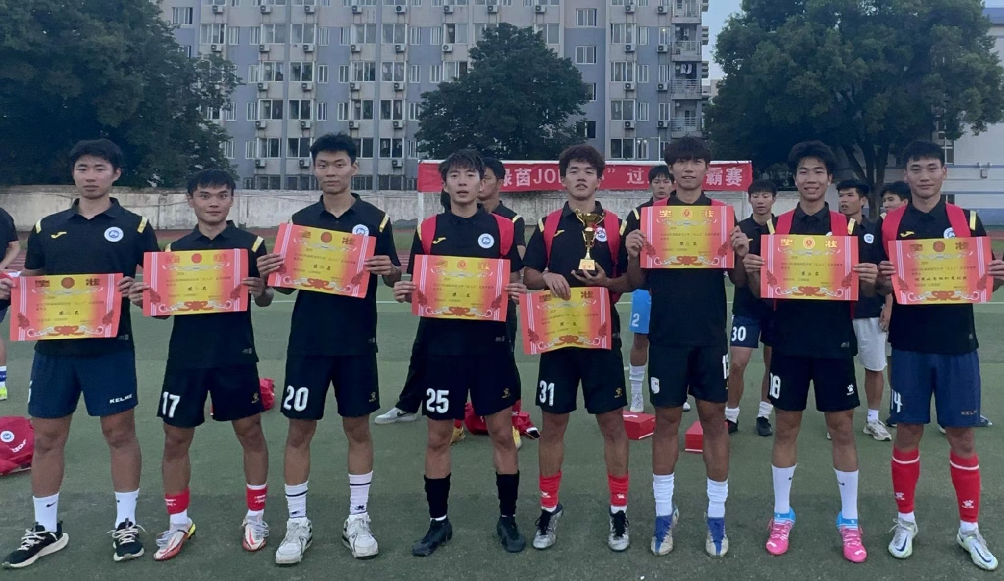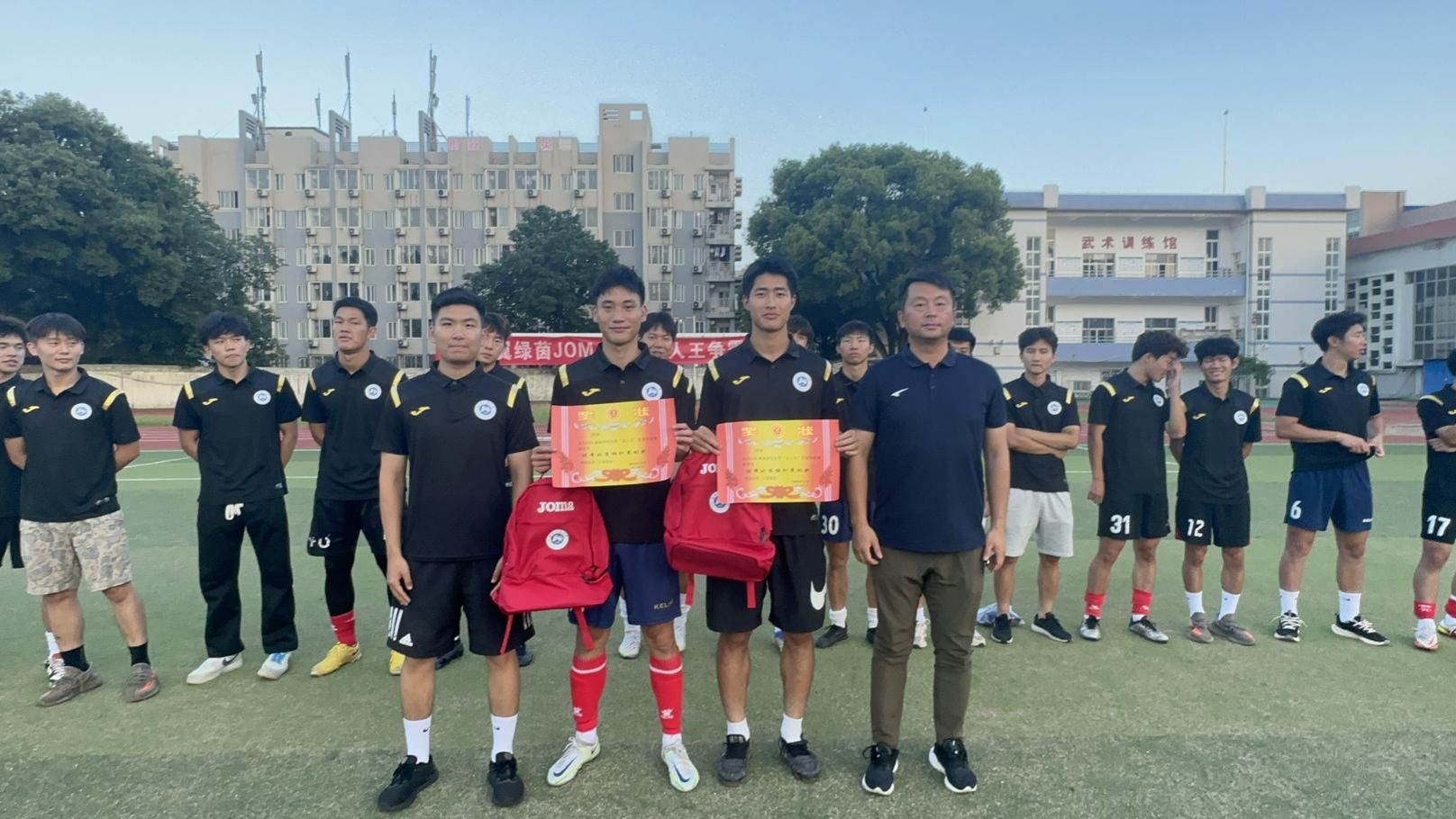 2021级运动训练专业足球1班 韩鑫洋 同学,获得“最佳守门员”;2021级硕士研究生 常皓然 同学,获得“最佳裁判员”;2021级硕士研究生 瞿凌浩 同学、2022级运动训练专业足球1班 肖恩 同学获得“优秀比赛组织策划奖”。