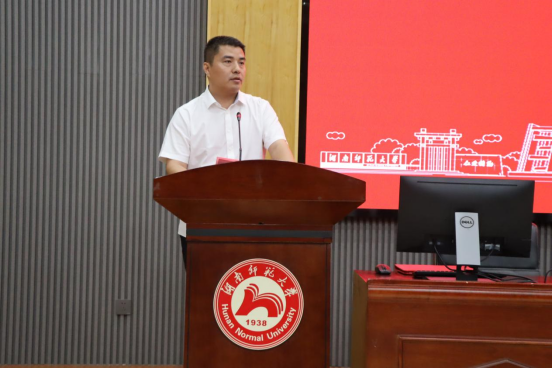 教师代表郭恒涛教授发言,主题是“以体铸魂,踔厉奋发”,并对同学们提出了几点意见:一、立大志,把握人生方向。作为新时代青年应该树立理想信念,坚定不移听党话,跟党走。二、明大德,擦亮青春底色。要始终遵守学术道德,规范并保持良好的科研精神,严于修身律己,积极向真、向善、向美。三、成大才,练就过硬本领。要开拓体育学科知识的广度和深度,能创新不断提出问题,提出理论和实践的持续出新,并进行多学科批判性阅读。四、担大任,永葆担当精神。要准确把握体育学科所处的历史方位,深刻理解新时代体育学科的新矛盾、新使命以及新要求。