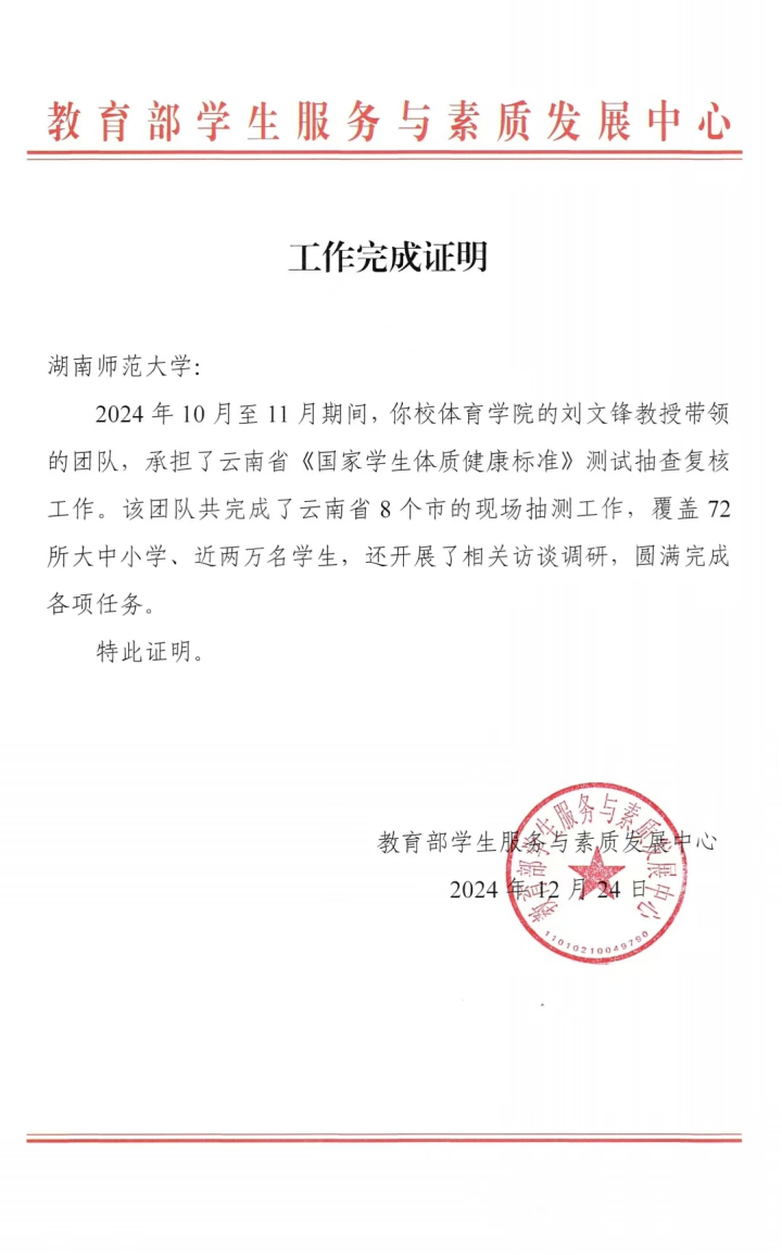 2024年12月24日,教育部学生服务与素质发展中心向我校发来云南省《国家学生体质健康标准》测试抽查复核工作完成证明,这是教育部第一次发布。