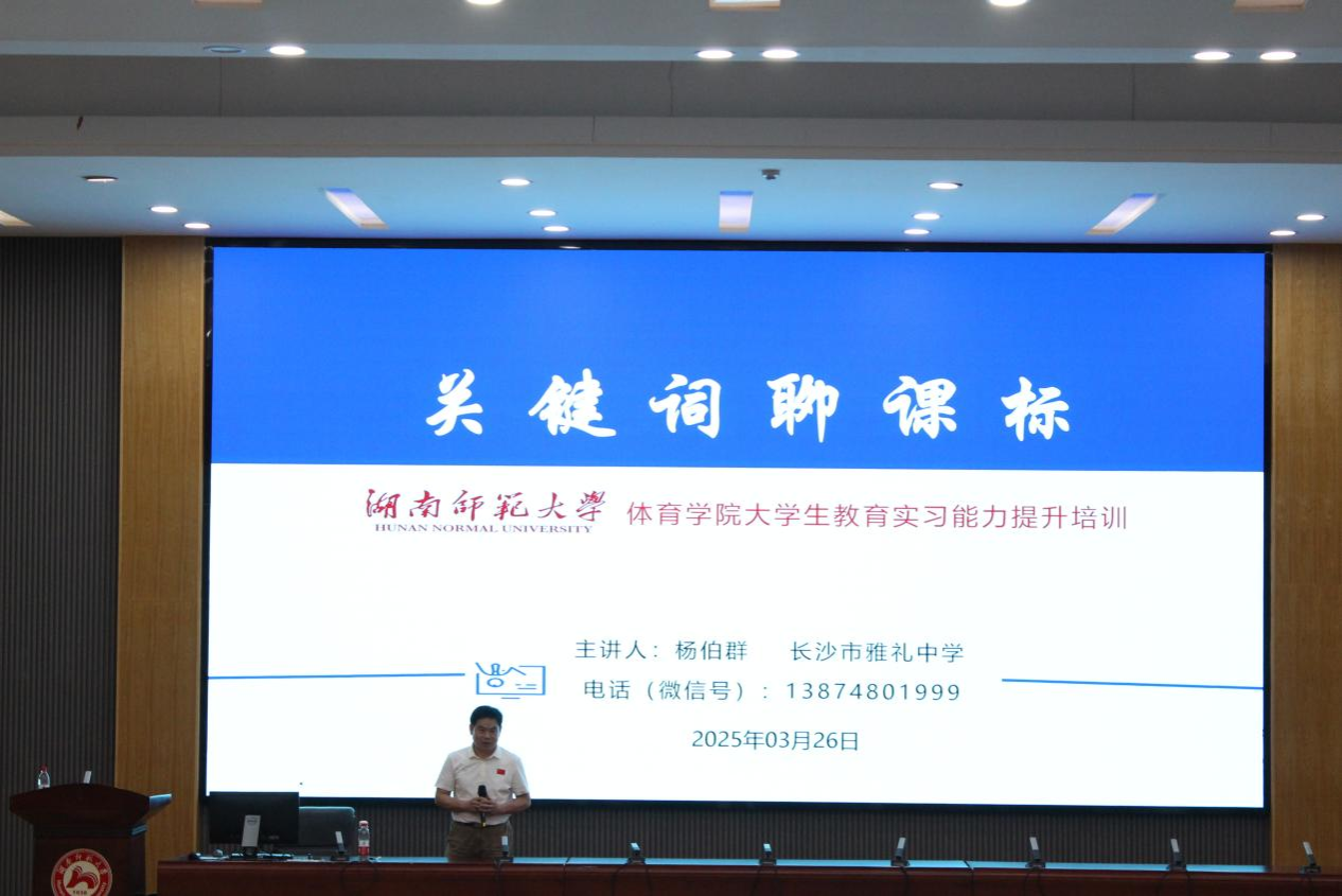 2025年3月26日晚,William威廉官网于鸿健楼二楼多媒体报告厅召开“关键词聊课标”为主题的教育专家培训讲座,旨在提升湖南师大2022级体育专业学生的教育实习能力,为他们未来投身教育工作筑牢基础。本次讲座由长沙市雅礼中学体育教师杨伯群主讲。各系部、教务办、学工办教职工代表、实习队全体队员出席此次会议。此次讲座由学工办主任夏禹老师主持。