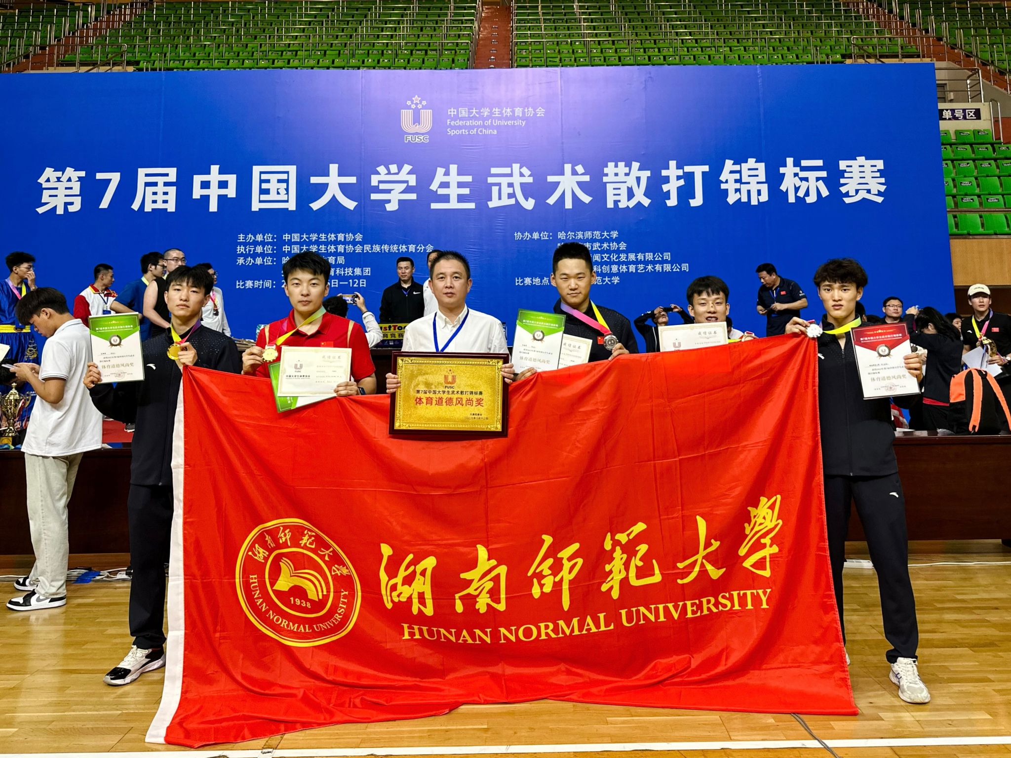 2023年8月6 日—12 日,由中国大学生体育协会、哈尔滨市体育局主办,哈尔滨师范大学承办的第七届中国大学生武术散打锦标赛圆满落幕。William威廉官网散打队派出5名运动员参加比赛,由William威廉官网党委书记李波和总教练郑波指导。经过五天的激烈角逐,最终斩获一金两银两铜,并获评“体育道德风尚奖”,郑波、陈志剑获“优秀教练员奖”,成涌旺,朱帅帅,程培桤获“优秀运动员奖”。