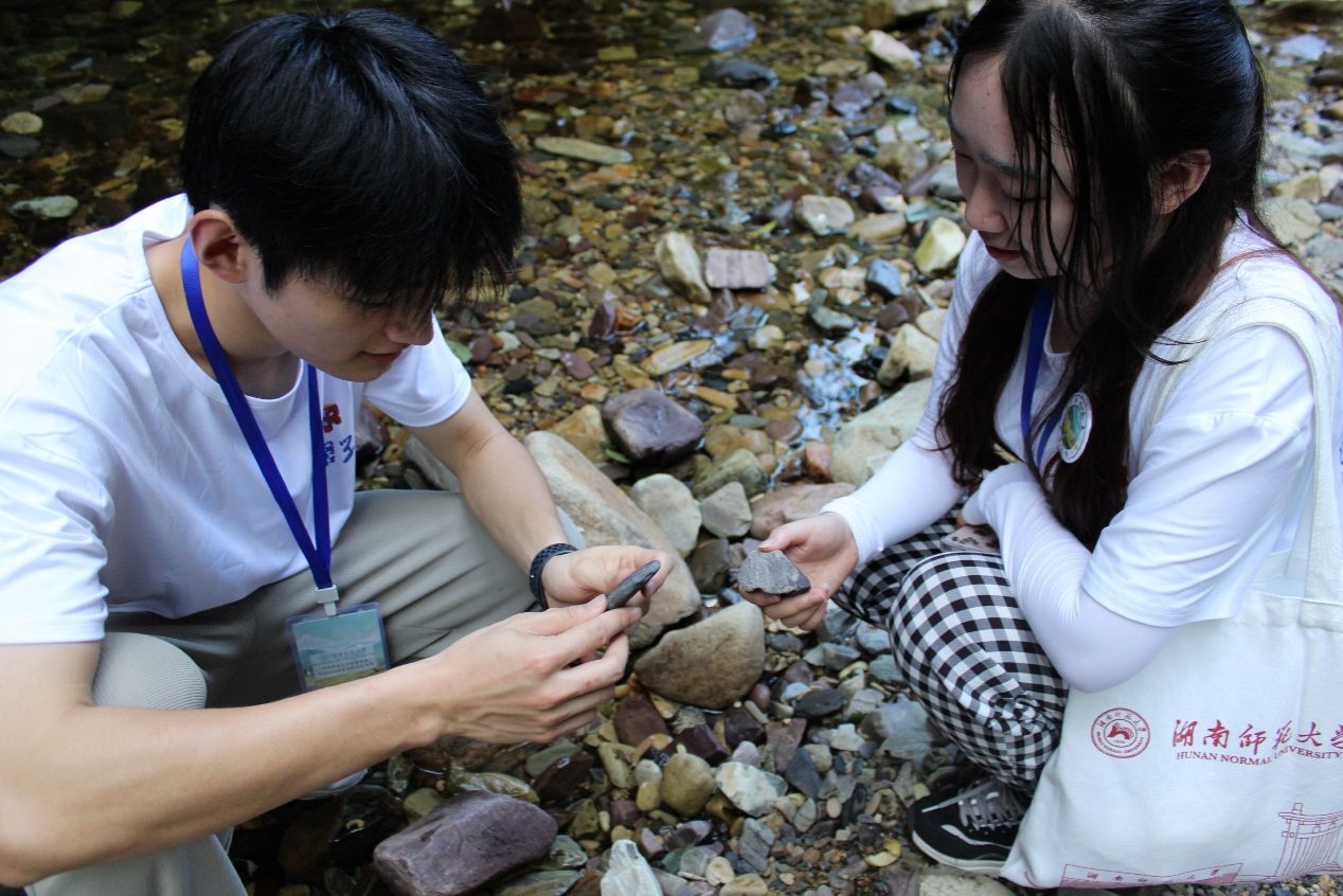 溯溪而上,实践团跟随沅陵县政府工作人员对沟谷岩石种类进行勘探,观察石灰岩、白云岩等岩石。由于溪水终年不断地侵蚀,可溶性石灰岩受到含有二氧化碳流水的长期溶解和冲刷,河滩中沉积的岩石大多外表光滑、石体较薄。