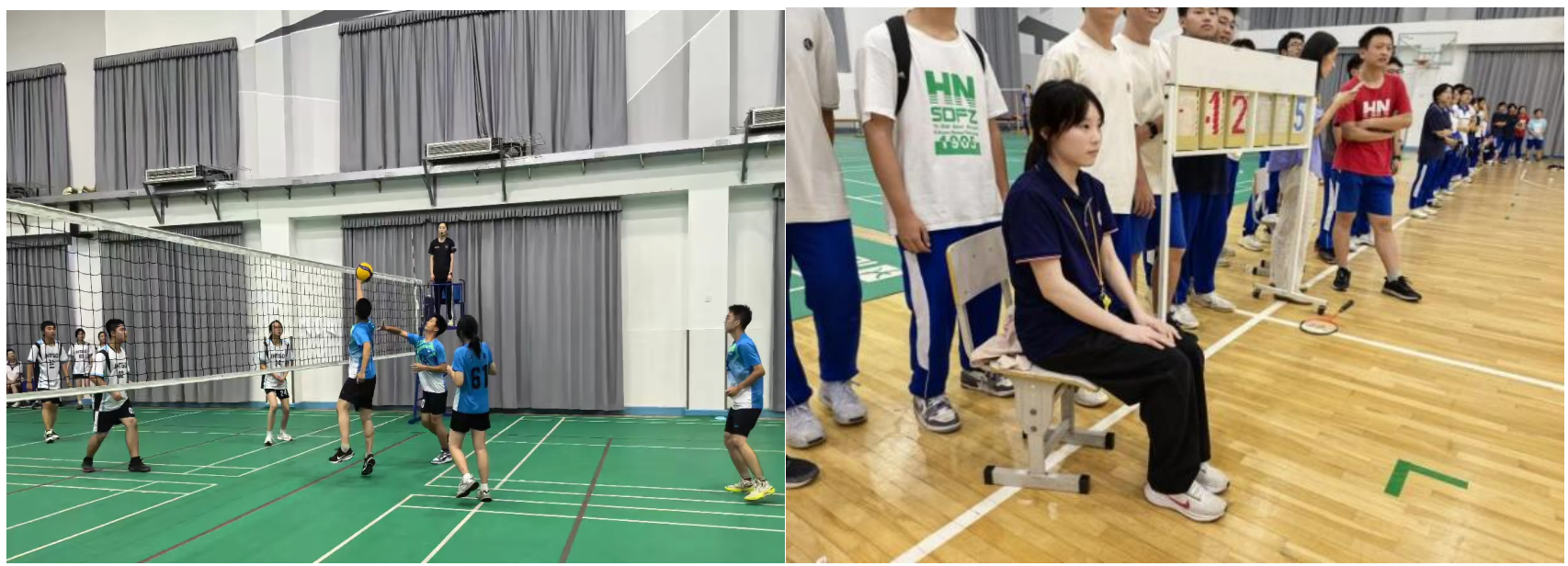室内体育馆内,实习队员参与排球比赛组织,负责比分记录、场地管理等事务。学生们发挥协作能力,发球、垫球、扣杀等动作流畅,现场气氛热烈。